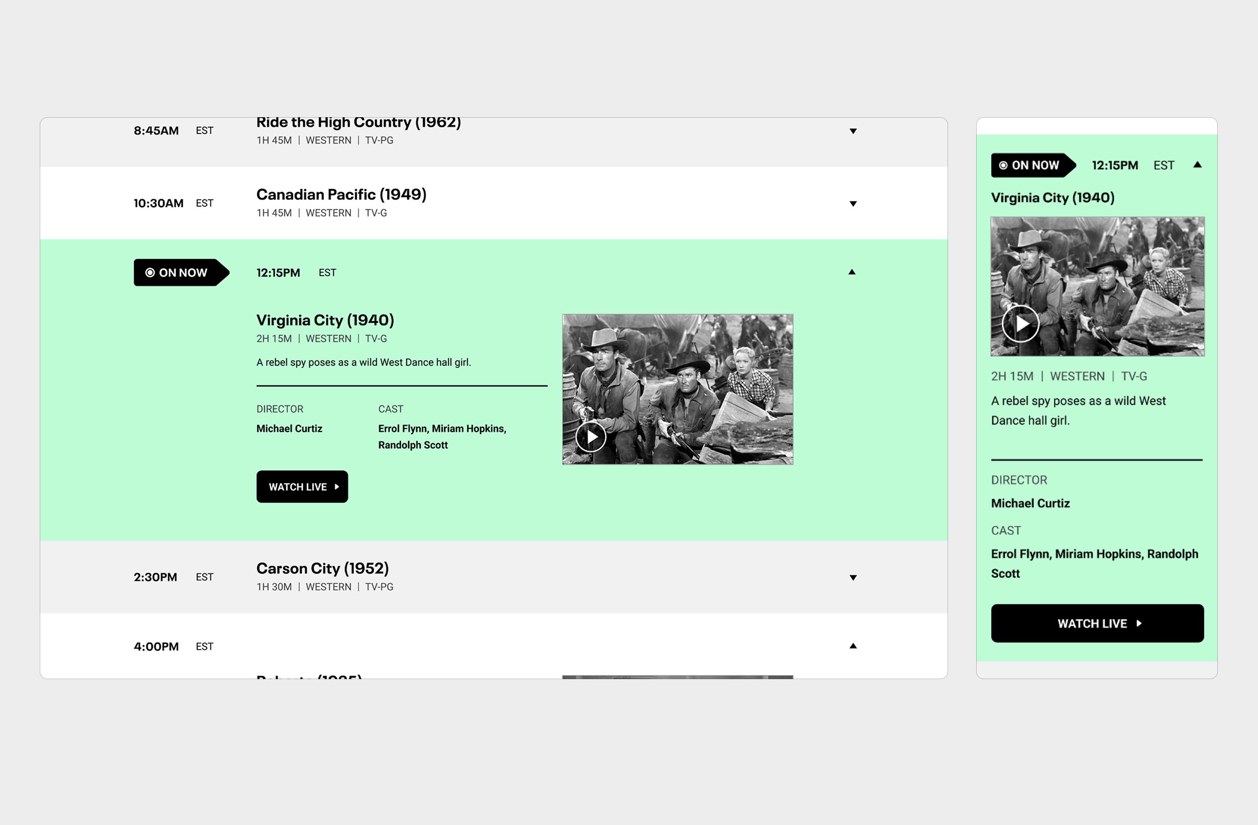 Data flexibility: The layout and interaction model were built to accommodate varying levels of metadata — from complete film details to minimal airtime information — ensuring the schedule remained functional even when data sources changed.
