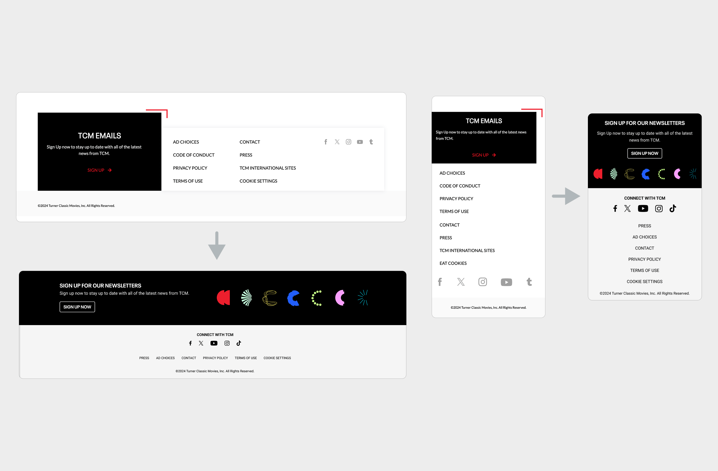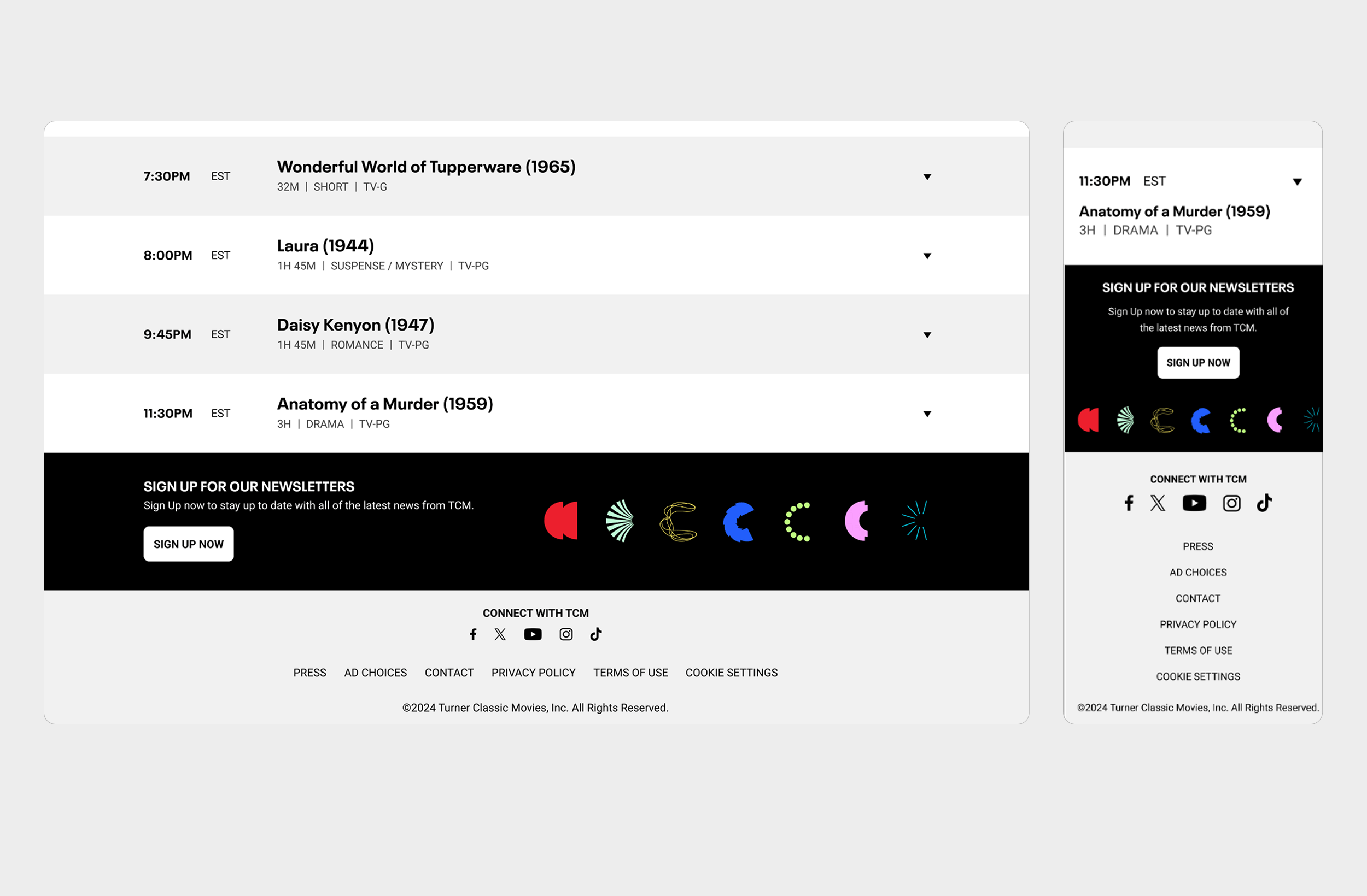 Visually, I collaborated closely with TCM’s creative director to evolve the page’s aesthetic — introducing brighter, cleaner colors and refined typography that reflected the refreshed brand while maintaining the timeless feel fans associate with TCM.